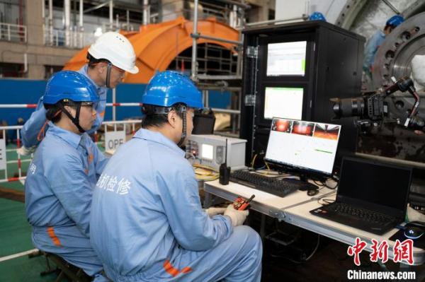 技术人员指挥“悟空”工作 在2021年N205大修(宁德核电站2号机组第5次大修),当时的“悟空1.0”版本首次进入了发电机内部。短短一天的测试,让本来信心满满的王建涛发现了不少问题。经过梳理,王建涛记录了上百条改进意见。 王建涛说,在之后的一年多时间里,机器人大改了3次,原本的导轨式安装变成了磁吸式,机器人进入发电机变得更加简单,期间,仅磁吸材料就试验了5种;缩小机器人本体体积,将拥有不同功能的机器人进行组合,让其拥有“三头六臂”。 今年5月21日宁德核电站最新一次发电机大修中,改进后更加轻薄小巧的“悟空3.0”,沿着定转子环形气隙缓缓进入发电机内部,按照指令一圈一圈查看发电机内部情况,并通过传感器实时传输画面和数据。 据悉,结合中广核各基地核电机组的差异,这款机器人未来将“钻进”更多机型发电机“肚子”里,5年左右一次的抽转子工作预计将推至10年,甚至更久。