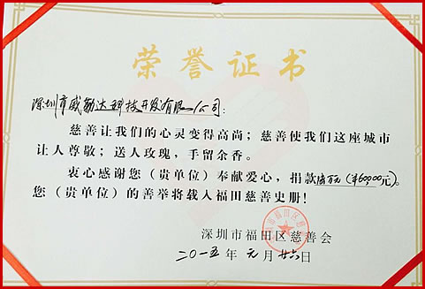 威勒达总公司向深圳市福田区慈善会捐款陆万元