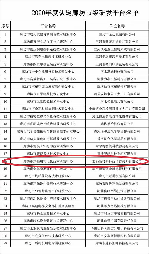 经过现场考察,推荐申报,专家评审,廊坊市科技局决定,廊坊市焊接用钨电极技术研发中心正式挂牌北钨新材香河公司。 作为中国唯一的一家市级钨电极研发中心,北钨新材将利用政府资金补助和技术资源加快钨电极产品的研发升级和产业升级!