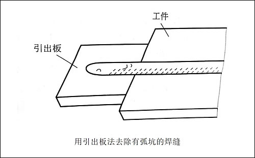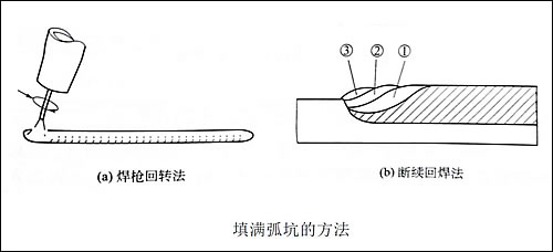 结束焊接时,切忌突然熄灭电弧,因为这样会在熄弧点处留下孤坑,而且弧坑处易产生裂纹和气孔等缺陷。为了克服这些缺陷,必须在熄弧过程中填满弧坑。一般采用如下几种方法。 ①逐渐拉长电弧法 首先在熄弧点稍做停留,然后慢慢地抬起焊枪,使电弧逐渐拉长,慢慢熄灭。这样可使弧坑填满,并使熔池金属在未凝固前仍受到良好的保护。最好还要配合使用图中的示出的方法。